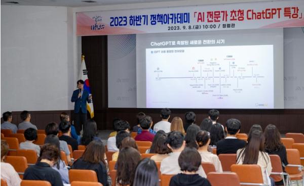 상반기 적극행정 특강에 이어 두 번째 열린 이날 강연은 직원들이 AI, 챗GPT 등 미래 신기술 동향을 공유하고 정부정책과 연계한 행정 도입 방안을 함께 모색하기 위해 마련됐다.