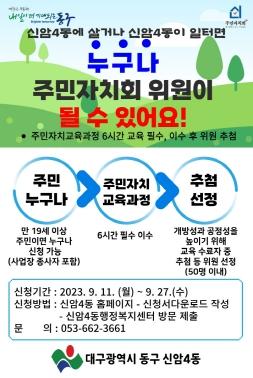 대구 동구청이 신암4동 주민 등을 대상으로 3기 신암4동 주민자치회 위원을 공개모집한다.