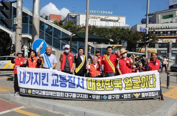한국교통장애인협회 대구중구지회 등 유관기관 관계자 100여 명은 지난 8일 명덕네거리에서 ‘교통사고 30% 줄이기, 교통사고 예방 캠페인’을 진행했다.
