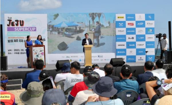 김희현 제주특별자치도 정무부지사는 8일 제주시 구좌읍 종달리 해안 일대에서 제주도가 주최하고 ㈔제주도 해양레포츠협회 주관으로 열리고 있는 2023년 제1회 제주국제슈퍼컵 카이트보딩 대회장을 찾아 선수들을 격려하고 관계자들의 노고에 감사 인사를 전했다.