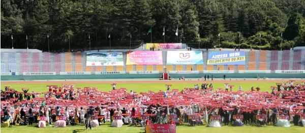안동시는 9일 의과대학 설립을 본격화하기 위해 국회의원, 시·도의원, 기관·단체장, 주민 등 2,500여 명이 참석한 가운데 '안동대 국립의과대학 유치 범시민 궐기대회'를 개최했다.