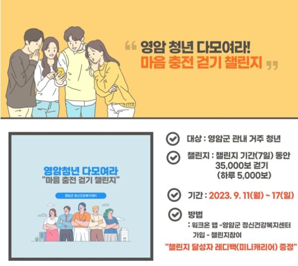 영암군이 10일 자살 예방의 날을 맞아 11일부터 17일까지 ‘청년 마음 충전 걷기 챌린지’를 진행한다.