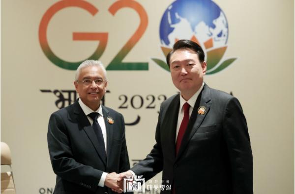 G20 정상회의 참석을 위해 인도 뉴델리를 방문 중인 윤석열 대통령은 오늘 (9. 10 일, 현지시간) 오후 '프라빈드 쿠마르 저그노스(Pravind Kumar Jugnauth)' 모리셔스 총리와 정상회담을 가졌다.