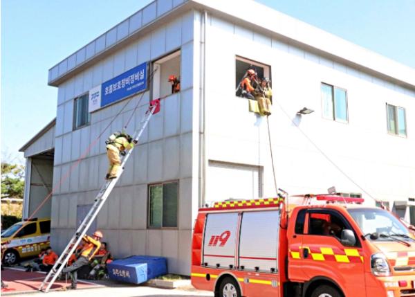 주요 내용은 ▲ 화재발생 시 긴급대피를 위한 방어적 자세 ▲ 협소 공간 진입·소방대원 구출 ▲ 사다리, 소방호스를 활용한 비상탈출 기법 등으로 진행됐다.