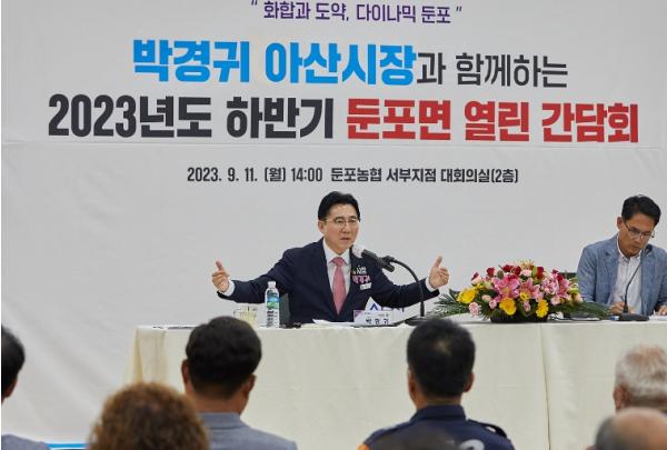 박경귀 아산시장은 11일 ‘2023 하반기 둔포면 열린간담회’에서 “면과 읍은 사업 추진 동력이 다르다”면서 “둔포는 베이밸리 메가시티 등 큰 사업의 주 무대인 만큼 단계적으로 읍 승격을 추진하겠다”고 말했다.