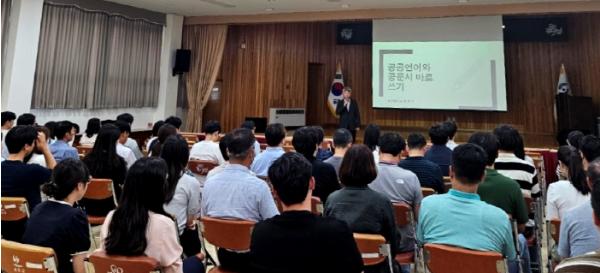 이날 교육은 청주대학교 정진수 교수를 초빙해 △공공언어의 의미 및 쉬운 언어의 요건 △공문서 정확하고 명료하게 쓰기 △보도자료 작성 시 표기 사례 등 누구나 이해하기 쉽고 바른 우리말 사용을 통해 민원인들과의 원활한 의사소통이 이뤄지도록 실무중심적 교육이 이뤄졌다.