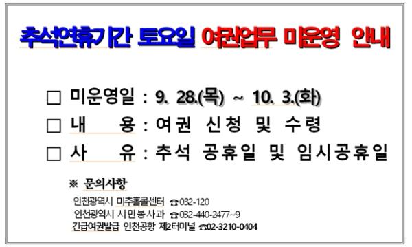 인천광역시가 추석을 포함한 황금연휴가 다가오자 해외여행을 계획하고 있는 여행객들에게 여권 만료일을 확인해 볼 것을 당부했다.
