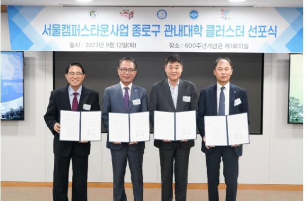 종로구가 2024년 서울캠퍼스타운 사업 대상으로 선정됨에 따라 지난 12일 성균관대학교 600주년 기념관에서 성균관대학교와 배화여자대학교, 한국방송통신대학교와 관내 대학 클러스터 조성을 위해 함께할 것을 약속했다.