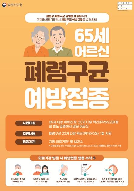 65세 이상 연령에서 폐렴구균 23가 다당백신(PPSV23)을 접종한 경우 추가접종은 불필요하나, 23가 다당백신을 접종하지 않은 어르신은 1회 무료 접종받으면 된다.