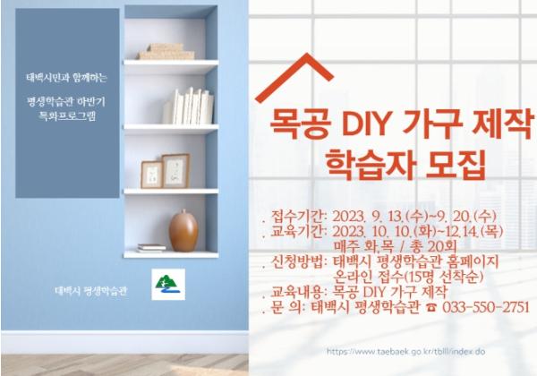 태백시는 2023년 하반기 특화 프로그램인 목공 DIY 가구 제작 과정의 수강생을 오는 13일부터 20일까지 모집한다고 밝혔다.