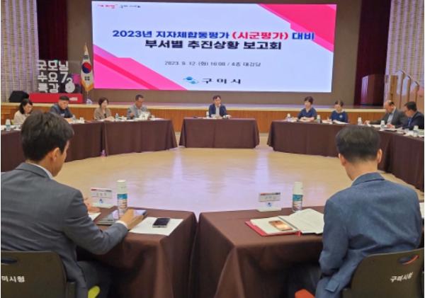 구미시는 12일 시청 대강당에서 부시장과 지표 담당 부서장 등 25명이 참석해 ‘2023년 지자체 합동 평가(시군 평가) 대비 부서별 추진 상황 보고회’를 열었다.