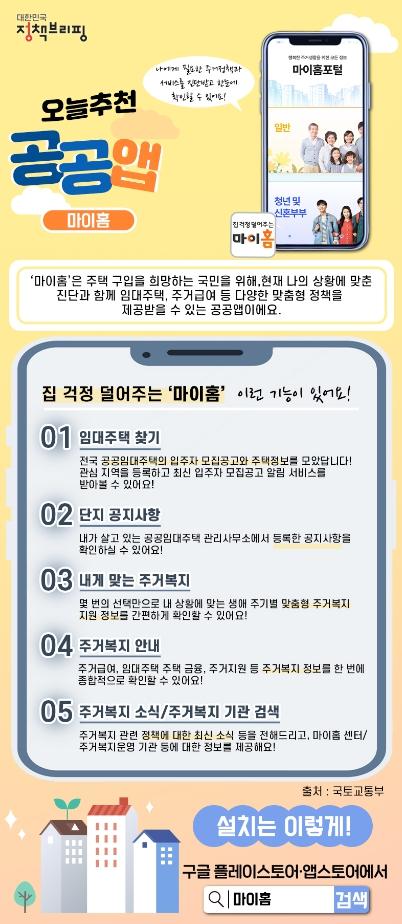 정부의 주요 주거지원정책을 한눈에 볼 수 있도록 지원하는 원스톱 통합 안내 서비스 ‘마이홈’ 앱을 소개합니다.