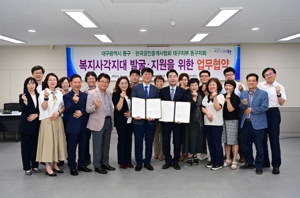 대구 동구청은 지난 14일, 복지사각지대 발굴 강화를 위해 한국공인중개사협회 대구광역시지부 동구지회와 업무협약을 체결했다.