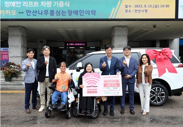 안산시는 지난 15일 ㈜카카오의 사회공헌활동으로 ‘안산나무를심는 장애인야학’을 위한 장애인 이동차량(카니발, 휠체어 1대 탑승 슬로프) 1대를 기증받았다고 16일 밝혔다.