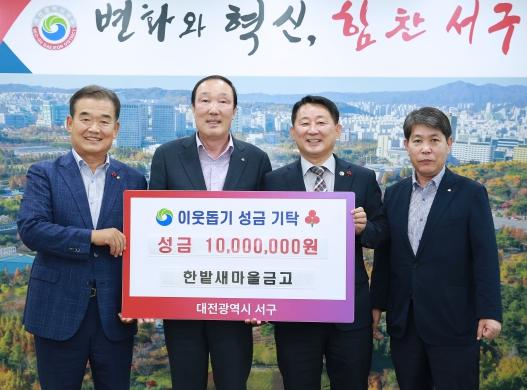 대전 서구는 MG한밭새마을금고로부터 이웃돕기 성금 1,000만 원을 기탁받았다고 17일 밝혔다.