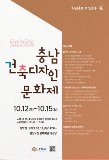 충남도는 다음달 12일부터 15일까지 4일간 도청 문예회관 일원에서 도내 최대 건축·디자인 문화행사 ‘2023 충남 건축디자인 문화제’를 개최한다고 18일 밝혔다.