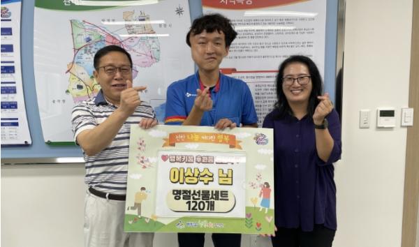 이상수 씨가 추석 명절을 맞이해 지난 15일 배방읍 행복키움추진단에 지역 내 기초생활수급자, 한부모 가정 등 어린이가 있는 저소득 세대를 위한 선물 세트(100만 원 상당)를 전달했다.