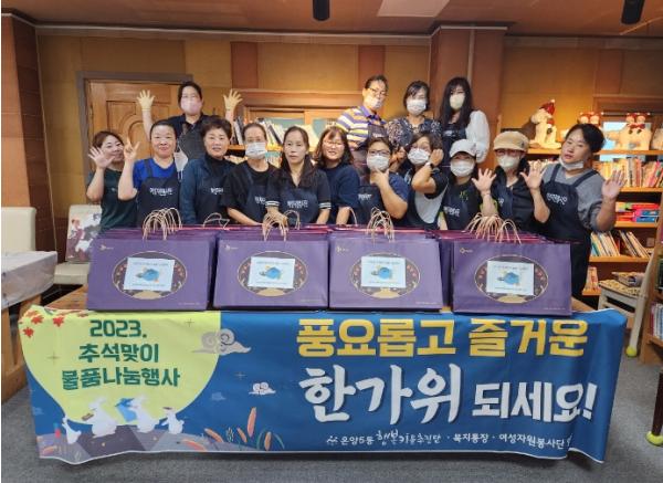 이미정 온양5동여성자원봉사단장은 “추석을 맞이하여 소외계층을 위해 봉사할 수 있음에 감사하고 어려운 분들에게 큰 도움이 됐으면 좋겠다”고 말했다.