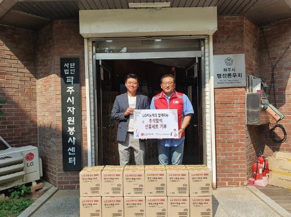 임강영 파주시자원봉사센터장은 “매년 추석이 되면 지역의 어려운 이웃에게 따뜻함을 전하는 엘지이노텍 임직원분들에게 감사드린다”라며, “우리의 마음을 담은 선물을 감사하게 받아주시는 이웃들과 어르신들이 풍성한 한가위를 보내시기를 바란다”라고 말했다.