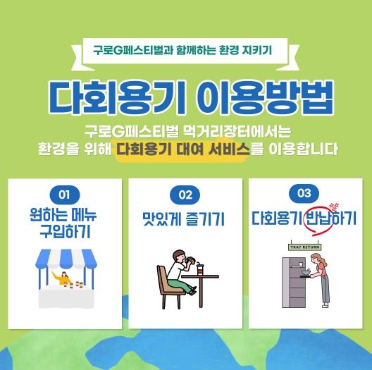구로구는 이번 행사에 다회용기 사용을 처음 도입한다. 이용객은 다회용기에 담긴 음식을 즐기고 사용한 용기를 전용 반납부스에 직접 반납하면 된다. 반납된 용기는 전문세척업체에서 세척한 후 검수 단계를 거쳐 재사용된다.
