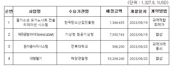 조달청은 ‘23.9.18.~9.22. 기간 중 해양경찰청 수요 ‘대형헬기’ 등 총 28건, 약 6,960만불 (약 924억 원, 1달러 환율 1,327.8원 기준) 상당의 외자구매 입찰을 집행할 예정이다.