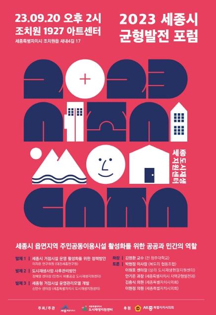 세종특별자치시는 오는 20일 오후 2시 조치원 1927 아트센터 다목적홀에서 읍면지역 주민공동이용시설 활성화를 위한 공공과 민간의 역할을 주제로 ‘2023 세종시 균형발전 포럼’을 개최한다.