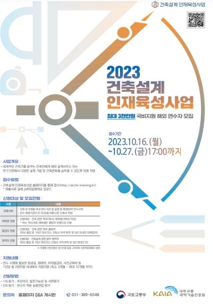 국토교통부는 건축설계 인재육성사업의 참여자를 국토교통부 산하 R&D전문기관인 국토교통과학기술진흥원(원장 박승기)을 통해 모집한다.