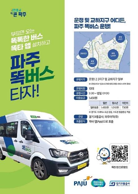 김경일 파주시장은 “파주시는 똑버스 증차와 운영체계 개선을 조속히 추진해 이용수요가 증가하고 있는 똑버스의 기능과 역할을 더욱 강화함으로써 편리한 대중교통 서비스 제공에 힘쓰겠다”라고 말했다.