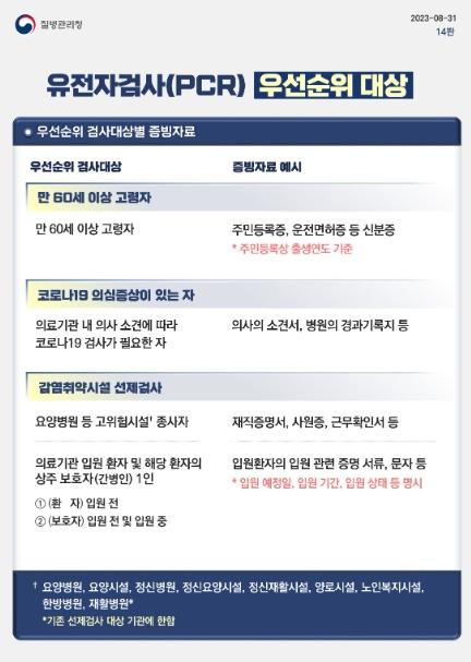 보건소 선별진료소 PCR 검사대상은 △만 60세 이상 고령자 △의료기관 내 의사 소견에 따라 코로나19 검사가 필요한 자 △감염취약시설 중 기존 선제검사 대상 시설의 종사자 △의료기관 입원 예정 환자와 해당 환자의 상주 보호자(간병인) 1인 등이다. 대상자는 증빙자료를 지참하면 무료로 검사를 받을 수 있다.