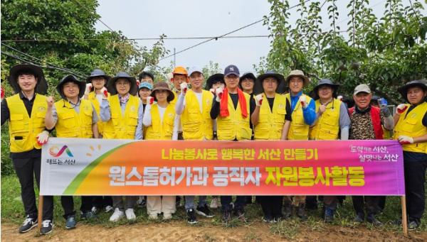 충남 서산시는 지난 19일 가을철 수확기를 맞아 고북면 사기리 배 과수 농가를 방문해 배 수확 농촌 일손돕기를 실시했다고 밝혔다.