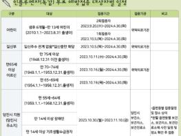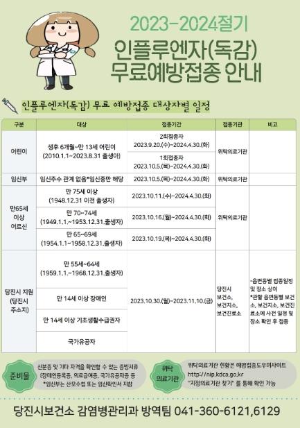 ▲9월 20일부터는 어린이 2회 접종 대상자(생후 6개월 이상 9세 미만 처음 접종 대상자), ▲10월 5일부터는 어린이 1회 접종 대상자(9세 이상)와 임신부 접종이 시작되며 ▲10월 11일부터 75세 이상 ▲10월 16일부터 70~74세 ▲10월 19일부터 65~69세 접종을 시작하며 오는 2024년 4월 30일까지 접종한다.