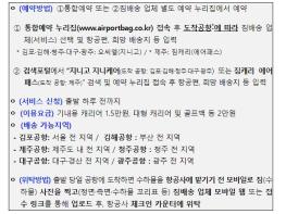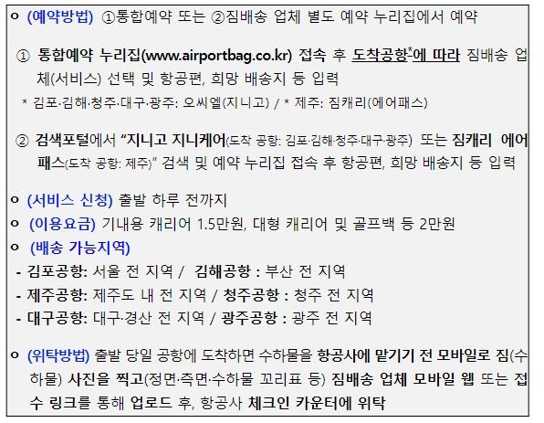배송 서비스는 서울, 부산, 청주, 대구·경산, 광주 전 지역에서 받을 수 있고, 출발 하루 전까지 통합예약 누리집 또는 짐배송 업체 누리집에서 서비스 예약이 가능하다.
