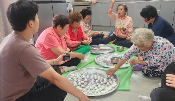 소이면 대장1리 경로당 노인회원들이 지난 19일 지역사회 나눔을 실천하는 재능기부 활동으로 추석맞이 송편을 만들어 소이면씨앗지역아동센터 이용 아동들에게 전달했다.