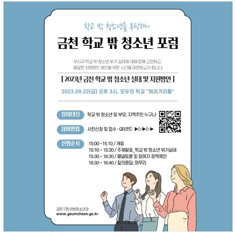 목원대학교 임재연 교수가 ‘금천구 학교 밖 청소년 위기 실태 연구’에 대해 주제 발표를 하고, 학교 밖 청소년 지원 현황, 위기 상황 대응, 청소년 정책 방향에 대해 토론한다. 이후 학교 밖 청소년과 부모들이 ‘금천구에 바라는 점’을 제안하는 순으로 진행할 예정이다.