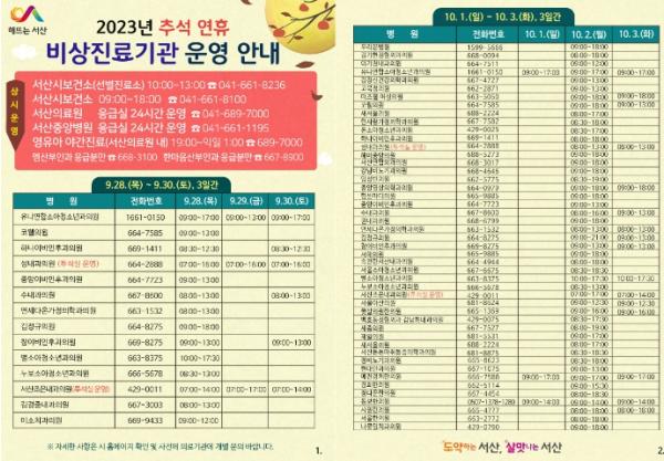 관내 지역응급의료센터인 서산의료원과 지역응급의료기관인 서산중앙병원도 24시간 응급실을 운영할 계획이며, 문 여는 병의원 101개소, 약국 94개소가 일자별로 지정?운영된다.