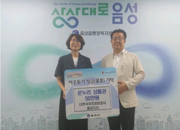 LX한국국토정보공사 음성지사는 지난 19일 음성읍 행정복지센터를 찾아 소외된 저소득층 5가구를 위해 써달라며 50만원(온누리 상품권)을 기탁했다.