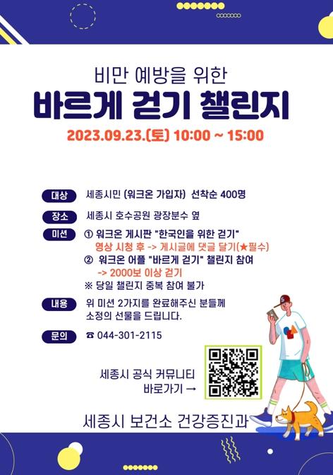 세종특별자치시보건소가 시민의 비만 예방과 건강증진을 지원하기 위해 오는 23일 세종호수공원에서 ‘바르게 걷기 챌린지’를 진행한다.