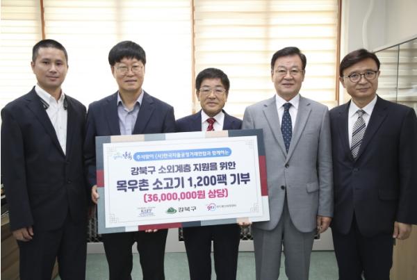 서울 강북구는 (사)한국자율공정거래연합이 추석명절을 맞아 저소득 가정을 위해 목우촌소고기 1,200팩(3,600만원 상당)을 지난 18일 구에 기탁했다고 밝혔다.