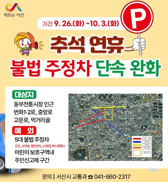 충남 서산시는 추석 명절을 맞아 귀성객 주차 편의를 높이고 전통시장 이용을 촉진하기 위해 9월 26일부터 10월 3일까지 전통시장과 주변 상가의 주정차 단속을 유예한다고 밝혔다.