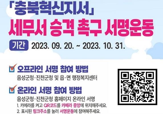 음성군은 국세 규모에 걸맞은 국세 행정 서비스 제공을 위해 진천군과 협력하에 충주세무서 충북혁신지서 세무서 승격을 촉구하는 서명 운동을 다음 달 31일까지 전개한다고 밝혔다.