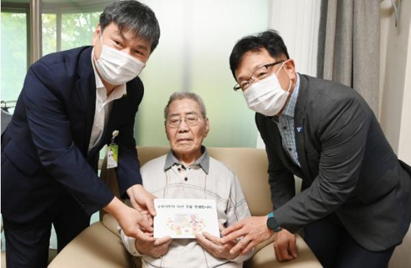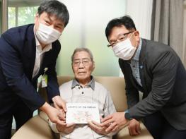 김현수 수원시 제1부시장이 19일 보훈원을 방문해 오성규 애국지사(100)에게 수원시 주민등록증을 전달했다.