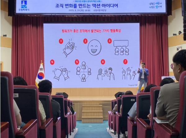 수원시 전 공직자를 대상으로 한 이날 교육에서 박태현 팀과리더이야기 대표는 ‘조직 변화를 만드는 액션 아이디어’를 주제로 ▲‘조직 변화와 혁신’ 무엇을 어떻게 바꿀 것인가 ▲부하직원들이 당신에게 알려주지 않는 진실 ▲언택트 시대, 협업이 승부처다 ▲‘팀십’ 뭉쳐야 산다! 팀으로 일하라! 등 내용을 강의했다.