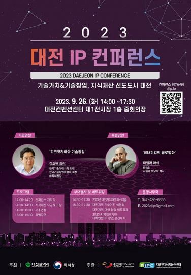 대전시와 특허청이 주최하고 대전테크노파크와 대전지식재산센터가 주관하는 ‘2023 대전 지식재산(IP) 콘퍼런스’가 9월 26일 대전컨벤션센터에서 열린다.