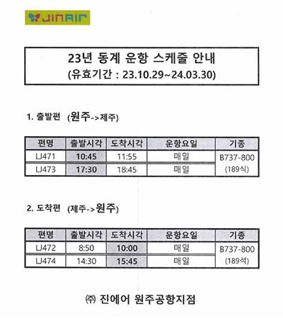 원주공항에 취항하고 있는 진에어는 최근 동계 항공기 운항 일정을 확정했고, 이에 따라 원주~제주 노선의 운항시간이 조정됐다.