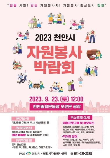 천안시는 23일 천안종합운동장 오륜문 광장 일원에서 자원봉사 문화를 확산하고 자원봉사자들을 격려하는 ‘2023 천안시 자원봉사박람회’를 개최한다고 밝혔다.