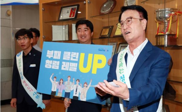 이날 ‘실천하는 청렴, 행복도시 사천’, ‘청렴의식 나이스, 부정부패 패스’, ‘부정청탁 거리두기 청렴문화 곁에두기 ’ 등의 문구가 새겨진 어깨띠와 피켓을 활용해 직원들의 생활 속 청렴실천을 독려했다.