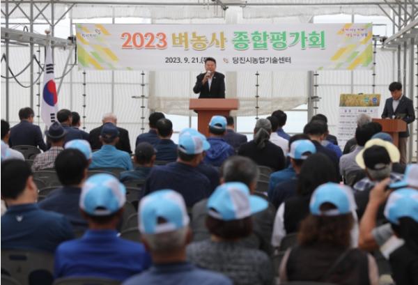 당진시농업기술센터는 21일 정미면 대운산리에 위치한 벼 신기술 평가단지에서 ‘벼농사 종합평가회’를 개최했다. 평가회는 오성환 당진시장을 비롯한 농업인 및 관계자 등 150여 명이 참석한 가운데 올해 벼농사를 평가·분석했다