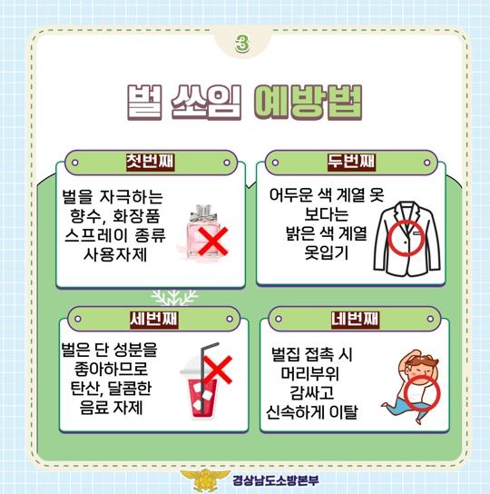 소방서 관계자는 “평소 벌 쏘임에 대한 예방법과 행동요령 등 숙지해 안전하고 즐거운 추석 명절을 보내길 바란다”고 전했다.
