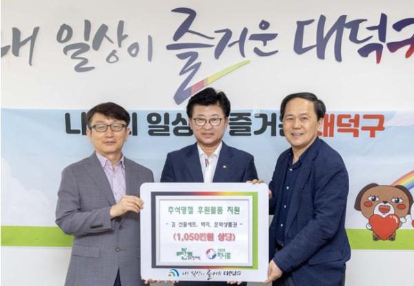 대전 대덕구는 추석 명절을 맞아 중리동에 위치한 경북한의원과 하나로클리닉의우회로부터 한부모가정 및 사회복지시설을 위한 김 선물세트, 백미, 문화상품권 등 1050만원 상당의 후원물품을 기탁받았다고 밝혔다.