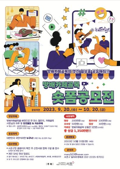 참여 방법은 15초 이상 60초 이내의 세로형 숏폼 영상을 본인의 SNS(인스타그램/유튜브)에 필수 해시태그(#서초구청 #서초구 #방배카페골목 #숏폼 #숏폼공모전)와 게시 후, 서초구 홈페이지 내 배너를 통해 공지된 링크로 신청서와 함께 제출하면 된다.